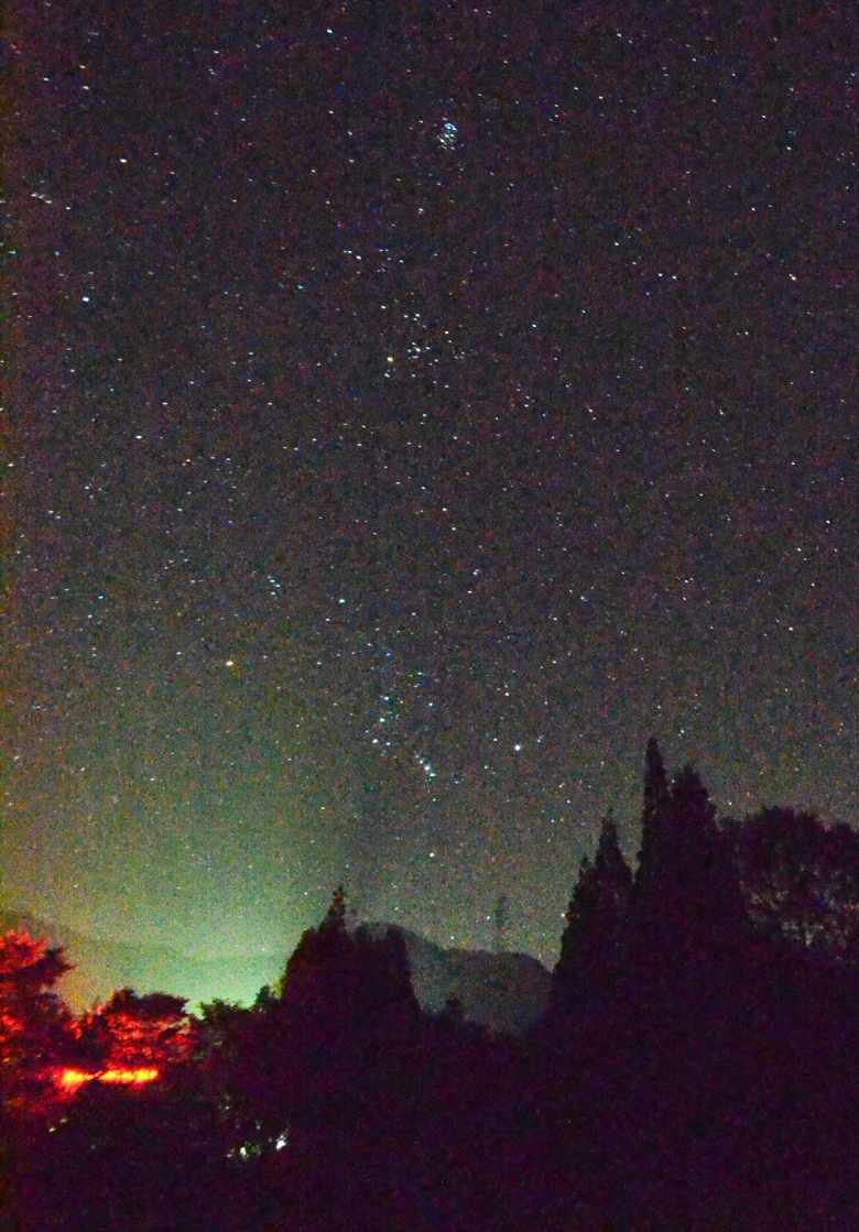オリオン座とすばる(プレアデス星団)。すばるは常にオリオンの前を西に向かっていくため、その美しさも相まって、神話では勇者オリオンを魅了した美しい7人姉妹がオリオンから逃げる姿にたとえられています。※写真上部中央に見える星の集まりがすばるです。