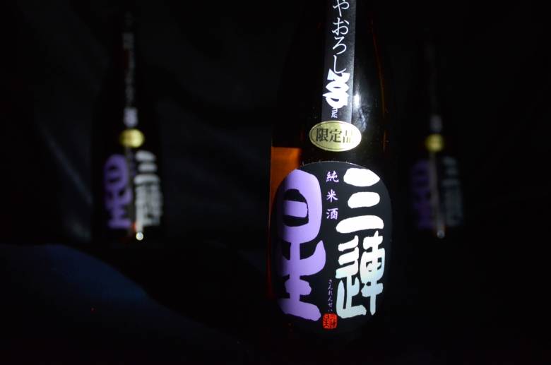 2月13日のアストロトークで連星のお話を聞きながら楽しめる日本酒「三連星」。ラベルは温度計になっており、温度変化によって色が変わるのも見どころのひとつです。(筆者撮影)