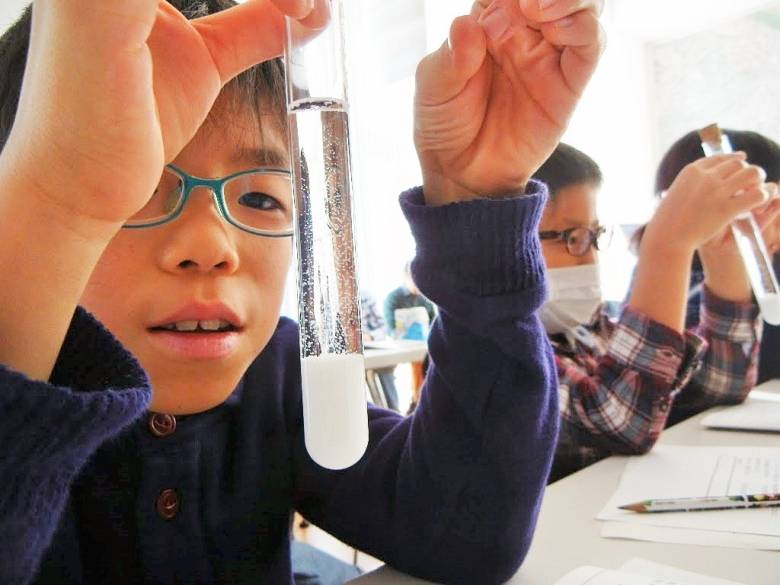 「天からの手紙」は上空で水蒸気が結晶になったもの。でも、結晶になる現場を直接観察することはできません。そこで、塩化アンモニウムをお湯に溶かし、冷えていく過程で結晶が現れる様子を、試験管の中で再現しました。目の前で雪のような結晶が降る実験に、子供たちは目を輝かせながら集中して取り組んでいました。