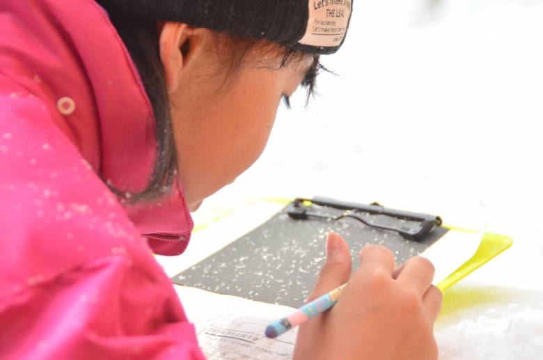 最初の活動は雪の結晶観察。黒い画用紙に雪を集め、ルーペで観察しながらスケッチ用紙に結晶の形を描いていきます。ひとりで一心不乱に観察し続けたり、面白い結晶を探して見せ合ったりと、雪の結晶の多様な姿に見入っていました。中には20種類以上の結晶を見つけ出してスケッチした子もいましたよ!