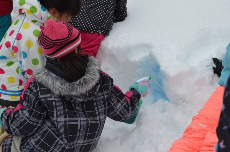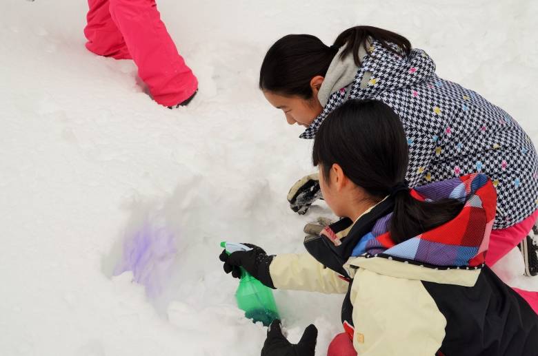 続いて、弱層探し。雪は日夜層を成して積もります。枝の多い結晶はお互いに絡み合って締まった層を作りますが、雹(ひょう)のように枝を持たない結晶からなる層は結びつきが弱いため、雪崩の原因になります。積雪の断面に色付きのスプレーを吹きかけると、層内での結びつきの強さに応じた模様ができます。そこで雪崩の原因ともなる弱層を、色の濃淡から探し出します。指で突っついたり、小さな雪崩を起こしてみたりと工夫しながら、雪の層から見えてくる苗場の天候の歴史を紐解いていました。