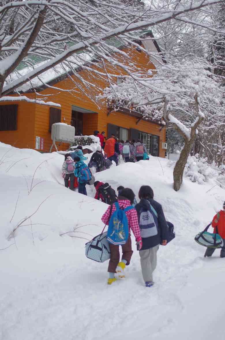 修学旅行初日の1月30日。雨の降る柏の葉を出発して4時間。苗場に到着すると一面の雪景色が目の前に広がります。暖冬で例年に比べると苗場の積雪量は少ないものの、柏の葉では見られない銀世界にみんな大はしゃぎ!泊まるのは、道路からさらに奥に登った、テレビもない無人の山小屋です。