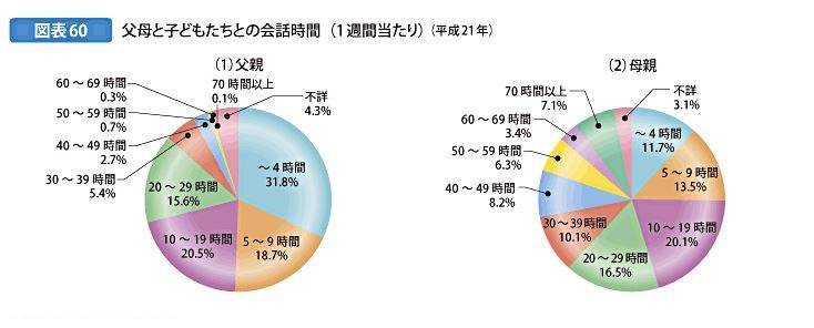 しかしながら現代では両親の共働きや帰宅時間が遅いこと、それぞれ自室で過ごす時間が多くなるなど、親子の会話時間は少なくなっています。内閣府の「子ども・若者白書」によると、1週間当たりの親子の会話時間は父親とは~4時間、母親とは「10~19時間」が最も多い結果に。これは1日に換算すると母親とは1.4時間~2.7時間、父親とはわずか34分程度です。みなさんのご家庭ではいかがでしょうか。