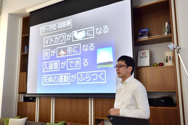 水が流れる・月が地球をまわる・潮が満ち引きする・太陽が丸くなる・人間が地上に立てる・雨が降るというものから、スカートがはける・電車が走る・顔のたるみ……など。たくさんの例が挙がりました。