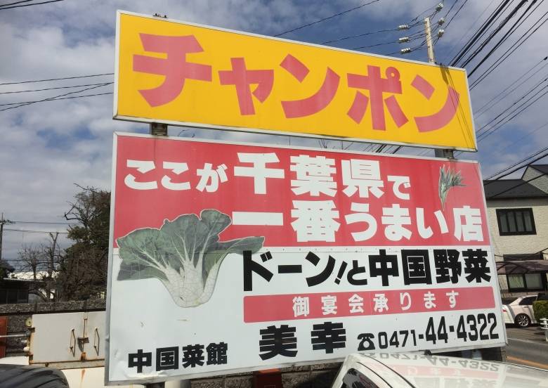 南柏から流山おおたかの森に抜ける都市軸道路(東深井市野谷線)を走っていると突然「チャンポン」という黄色い時に大きな字で書かれた看板が目に入ってきます。その下には堂々と「ここで千葉県で一番うまい店」という謳い文句も。