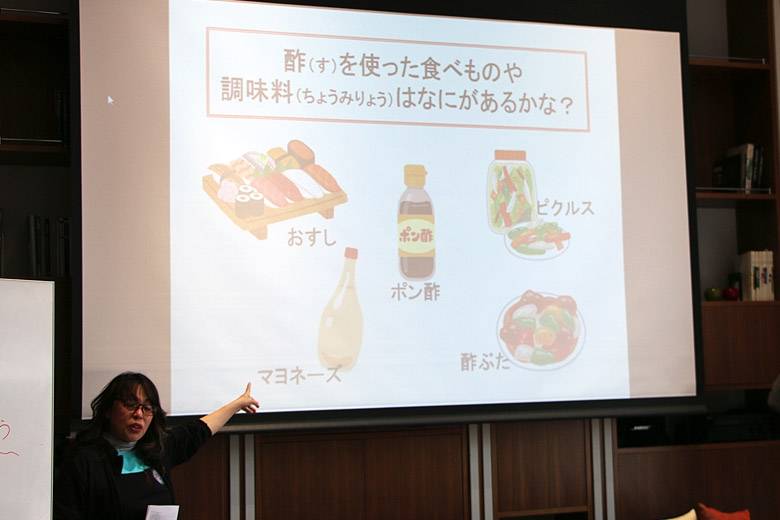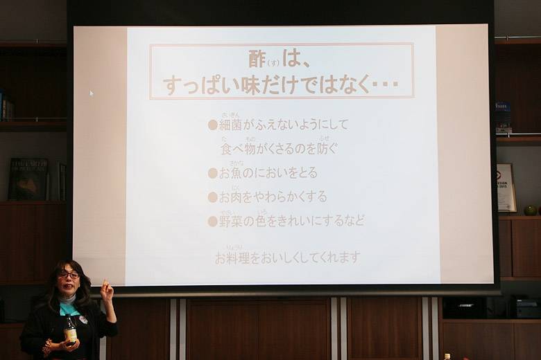 調理実習に入る前に「酢」の作り方、種類、役割などについて学んでいきます。