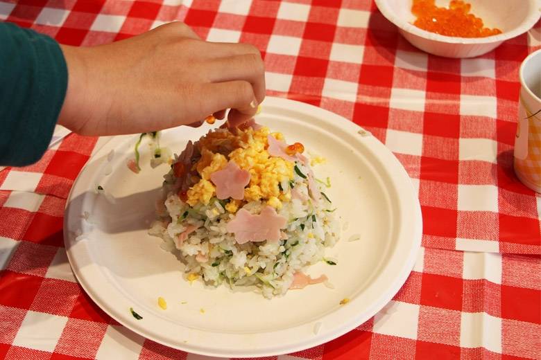 チャーハンのように丸く盛りつけたり、花型のハムの上にイクラを乗せたりと各自こだわりをもってちらし寿司を飾り付け。