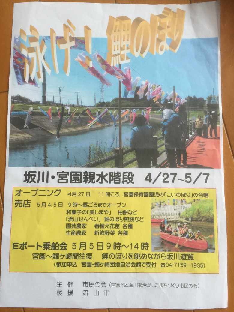 流山市のセンターで配布していたチラシによると、5月4日と5日の午前中には売店も出店され、5月5日にはEボートによる坂川の遊覧も行われたようです。あいにく私は今年は先約があって5月4日も5日も行けませんでしたが、いつか行ってみたいと思います。