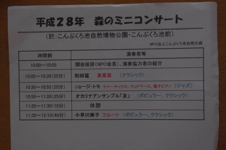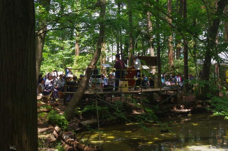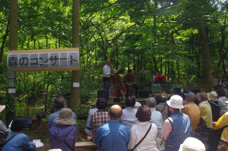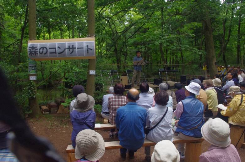 そのこんぶくろ池の湖畔でことしも恒例の森のコンサートが行われました。特設の木のステージと観客席は静かな森の風景にとてもマッチしており、神秘的な雰囲気の中200名以上の観客が音楽を楽しみました。