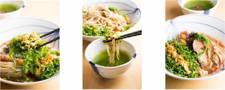 「饗 くろ㐂」では、7月1日(金)~7月9日(土)の期間、「かがやケールなつけ和えそば」を1日100食限定で提供中です(※)。「葉野菜の女王」と呼ばれるほど栄養価が豊富な食材「ケール」。苦味、えぐみが少なく食べやすいOisixの国産ケール「かがやケール」を具材やスープに活用していて4段階の食べ方が楽しめます。