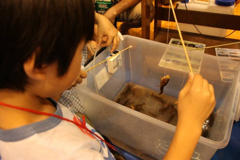 守谷里山ネットワークのブースではザリガニ釣りを体験。