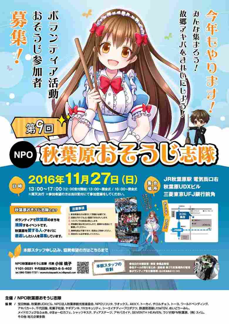 電気の街から最近はサブカルチャーの街に変貌した秋葉原ですが、近年にぎわいの一方でごみの不法投棄が問題となっています。ポイ捨ての小さなごみから、家電用品、読み終わった雑誌や、食べかすなども。街の人の掃除ではとても追いつかない現状を憂いて2002年に始まったこの「秋葉原おそうじ志隊」。メイド服姿にコスプレして参加する人などもいて一時期は盛り上がったものの、2009年で一旦終了。このイベントが昨年に復活し、今年も11月27日(日)に行われます。