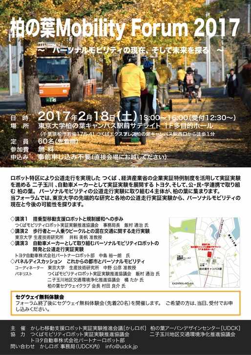 過去にも何度か開かれている柏の葉Mobility Forumが今年は2月18日に東大の柏の葉キャンパス駅前サテライトで開催されます。今回は、フォーラム終了後にセグウェイ無料体験会(先着20名)を開催するそうです。当日、受付でお申し込みとのこと。