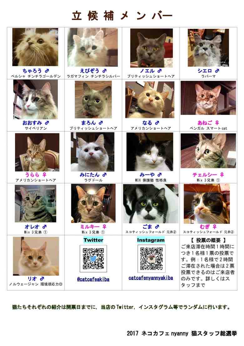 当店では,初めて行う総選挙です。それぞれの猫スタッフに熱烈なファンがおり、大幅な激戦が予想されます。ご来店滞在時間1時間につき1票ずつ投票できますので,是非ともたくさんのお客様にご投票頂きたいと思います。