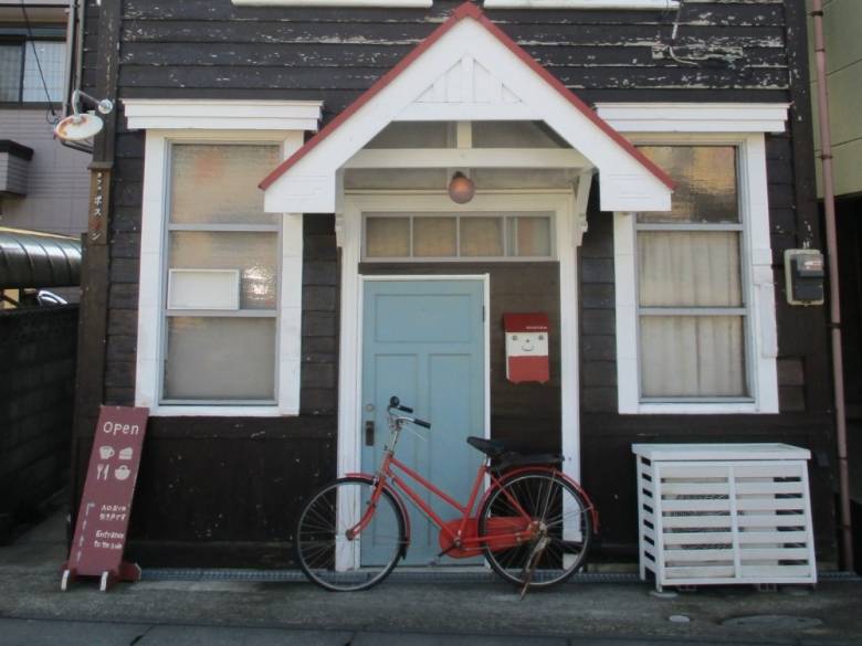 カフェ「ポステン」らしい建物を見つけましたが、OPENの看板が見えているのに、入口に自転車が置いてあります。