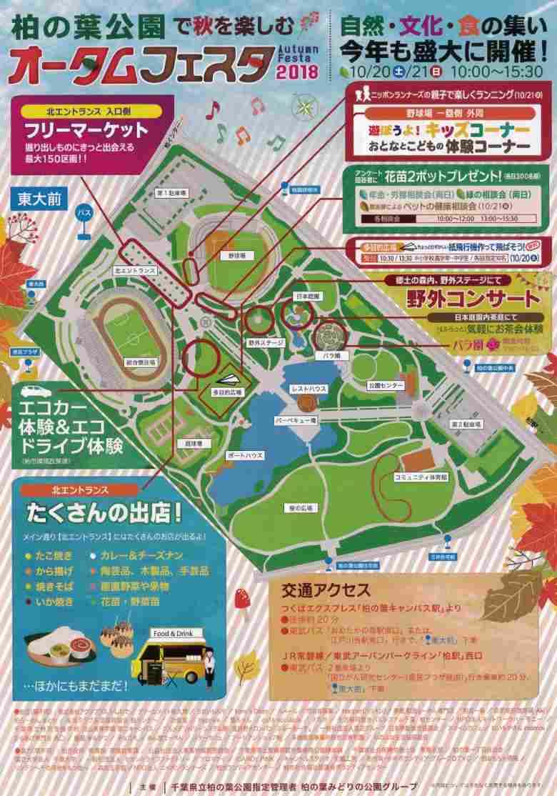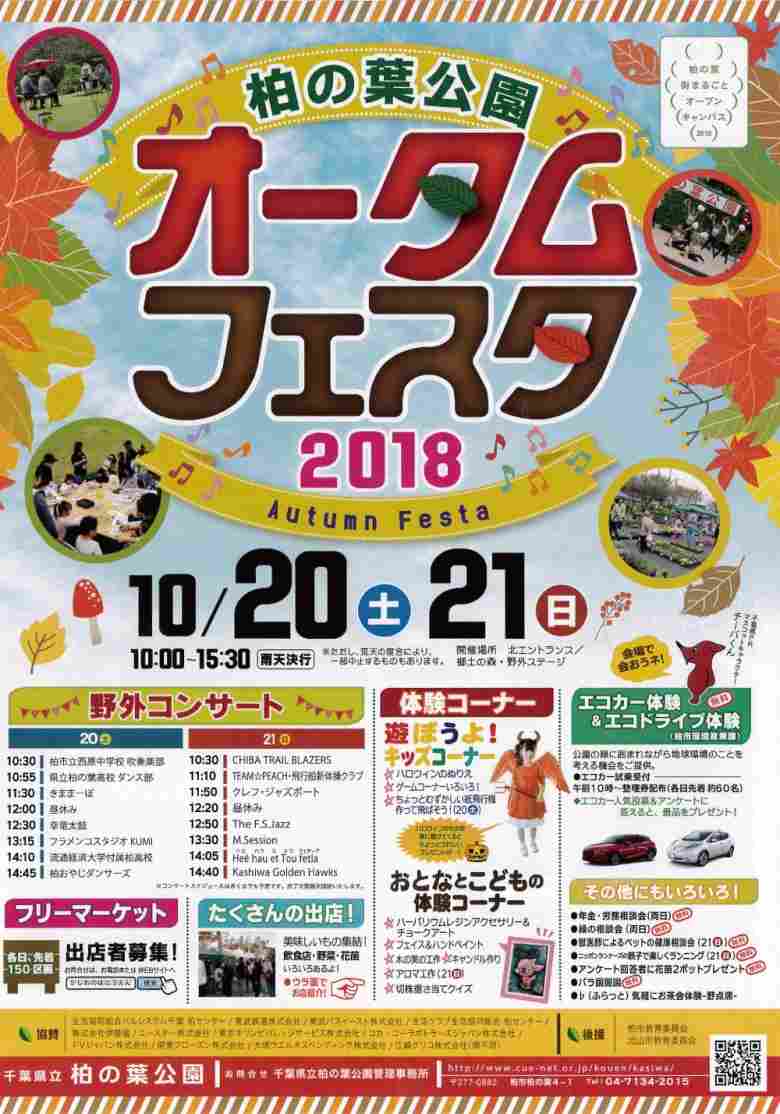 恒例のオータムフェスタは今年も皆様の期待にお応えし、楽しいイベントが目白押し!ぜひご来園ください。催し物は、野外ステージコンサート、おとなとこどもの体験コーナー、ゲームコーナー、エコカー試乗体験&展示会(雨天中止)、フリーマーケット150区画、飲食出店多数、アンケートに答えると花苗プレゼント(各日300名)など。