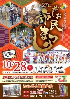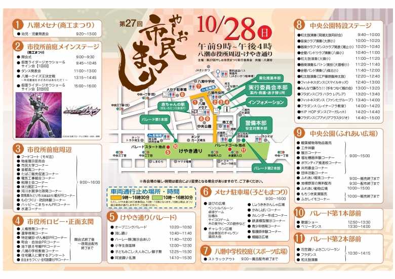 やしお市民まつりは、パレード、物産模擬店、露店はもちろん、キャラクターショー、動物とのふれあい体験、ものづくり体験など催しがたくさんあり、全ての世代の方に楽しんでいただけるおまつりです。 けやき通りで行う流し踊りは、当日飛び入り参加できます。お友だちを誘ってぜひご参加ください。 注記:今年のパレードは「ハロウィン」をテーマに実施します。