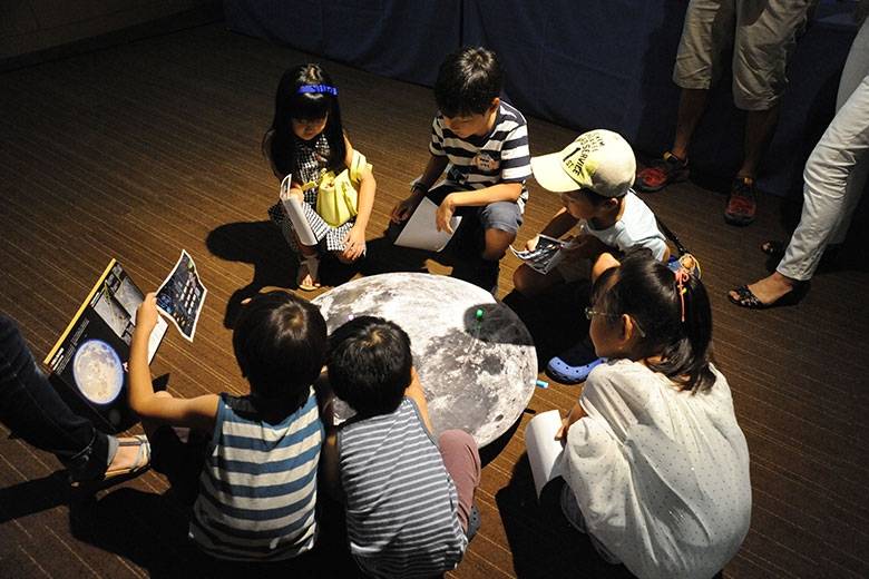そのほかにも、自分で色とりどりに塗った宇宙の絵を光にかざすことで万華鏡のように楽しむことのできる「宇宙をつくろうワークショップ」やクイズ形式で月の砂について学べるワークショップも一日中大にぎわい。子どもたちが一生懸命取り組んでいる横で、多くの保護者たちが「これは夏休みの自由研究にちょうどいい」と話していたのが印象的でした。
