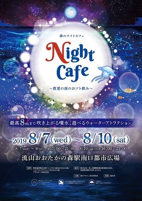 今年は会場が海の中に様変わり。光るクラゲも日本初登場!?美味しいグルメも盛りだくさん!日替わりフードもお見逃しなく。ここのしかない海の中で味わうグルメ&ビアを是非ご堪能下さい。光と音に彩られ、空高く舞い上がる華麗な噴水ショーは、ナイトカフェの風物詩。今年はミニステージでダンスイベントも開催!毎年大人気のウォーターアトラクションや、かわいい写真が撮影できる天使の羽噴水もお楽しみに!