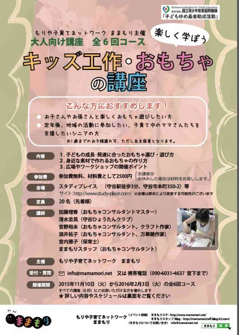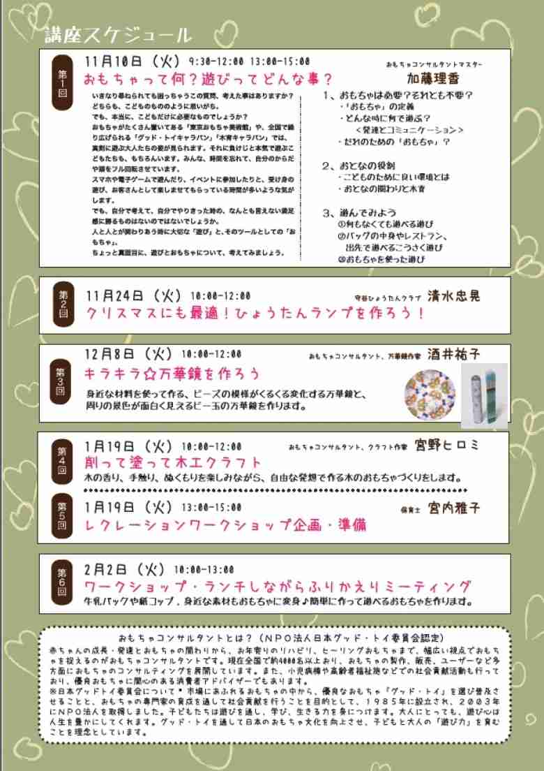 子育て中のママさんに人気のNPO東京おもちゃ美術館認定のおもちゃコンサルタントマスターの加藤理香先生の講座から、地元の守谷ひょうたんクラブ様によるワークショップ体験など、みんなで楽しく学べる講座になっております。