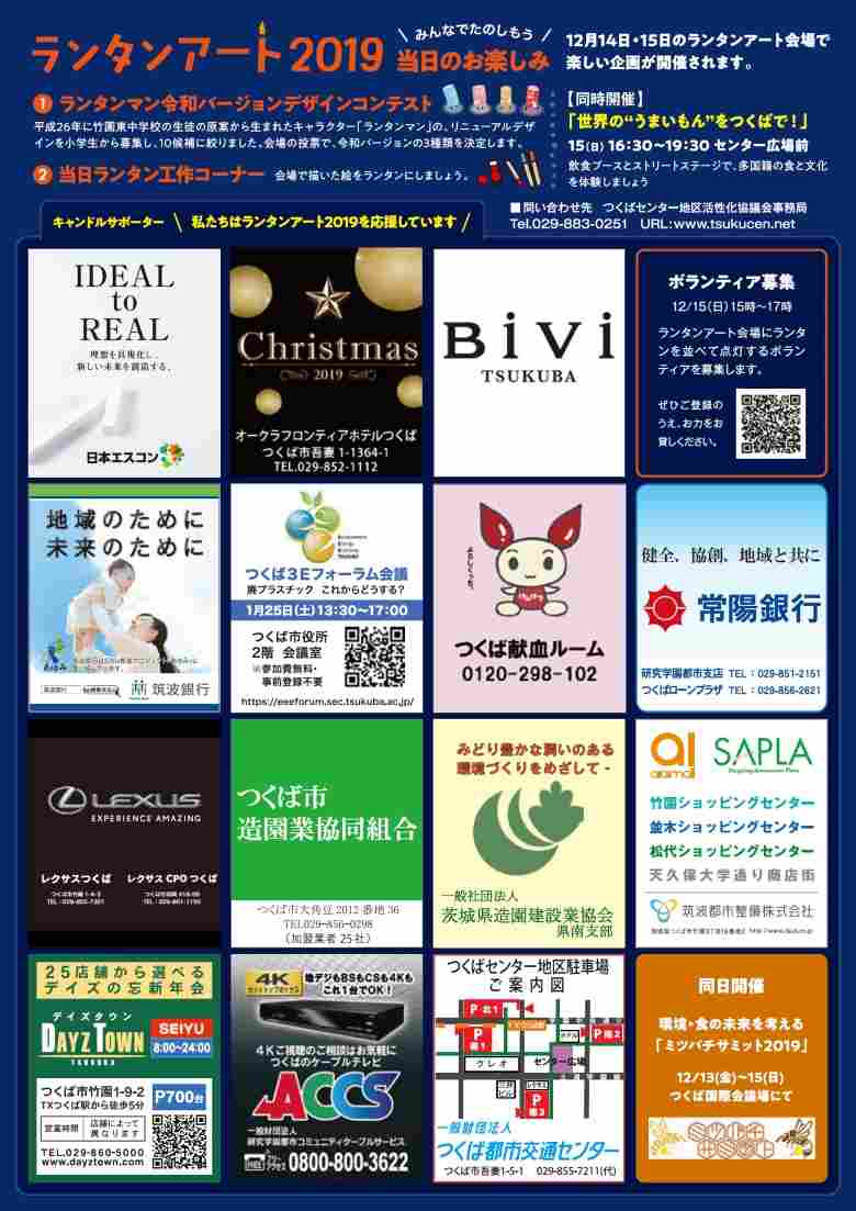 つくば市内の小中学生やつくばセンター地区で働く人々の手作りのランタン約7,000個がつくばセンター地区を灯す。ランタンアートのキャラクター「ランタンマン」の令和バージョンを決めるコンテストや、当日ランタン工作コーナー、ランタンアートの会場を巡って景品をもらえるラリーなどもあり。