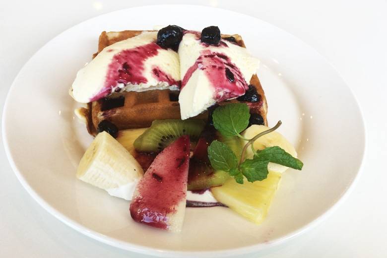 焼き立てのワッフルに、たっぷりのバニラアイスとフルーツが添えられているので、