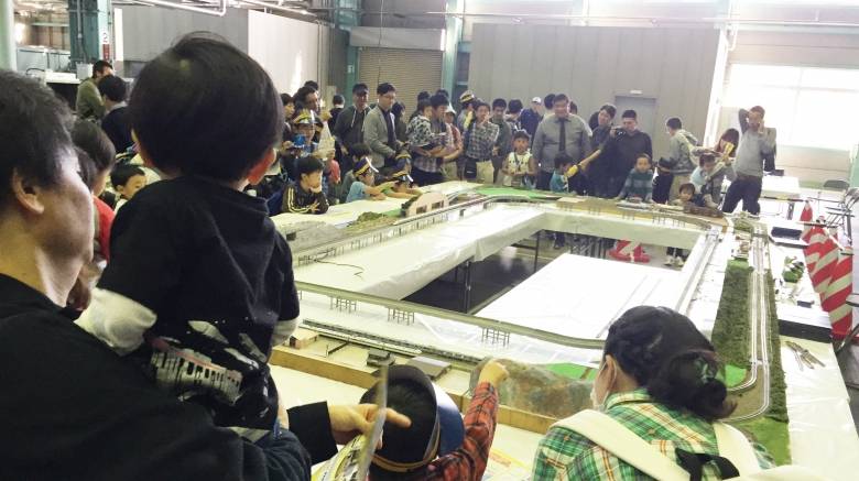 工場奥では大きな鉄道模型の展示もありました。家ではなかなか出来ない、長く大きな線路を走るジオラマを囲んで、大人も子供も釘付け。