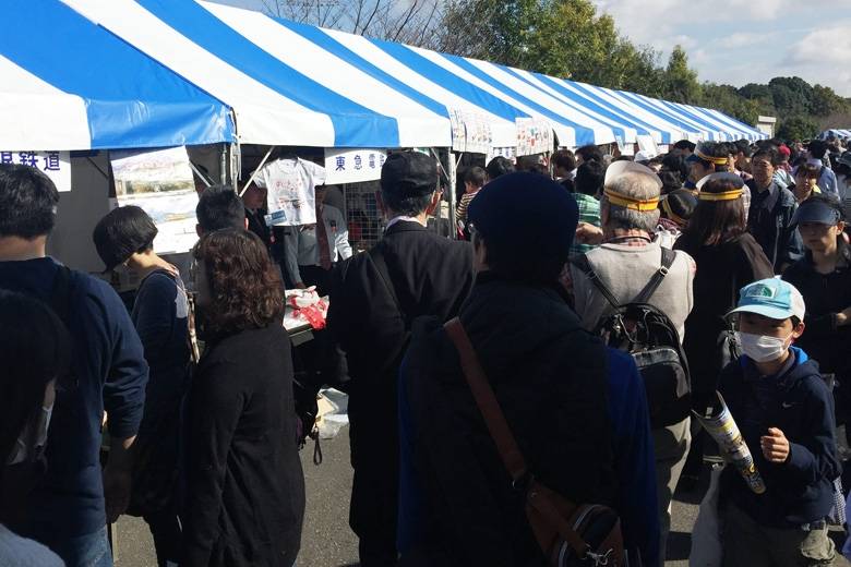 すごい賑わいです。会場の南側にある通路から、続々と工場へ向かう人の流れがありました。途中、通路の左側には様々な鉄道会社の出店ブースもあり、グッズを買う人で通路がいっぱいになっているところも。パンフレットには「正門から徒歩約15分」と書いてありましたが、そんなに距離を感じる事もなく、工場入口へ到着。
