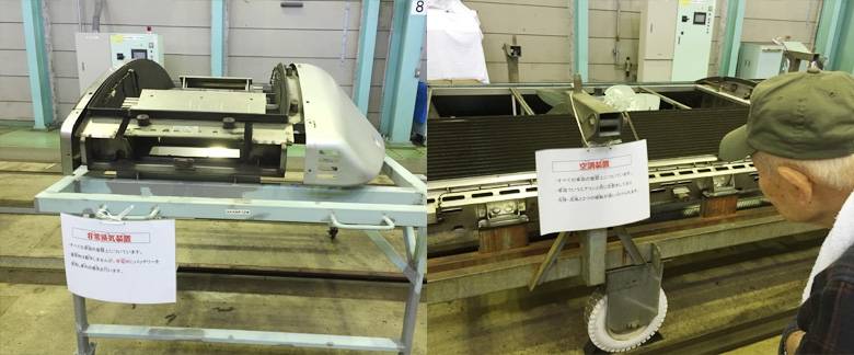 そして工場見学の後半は、パンタグラフや蓄電池(バッテリー)、ブレーキ部品、空調装置などの部品展示をすぐ近くで見ることができました。