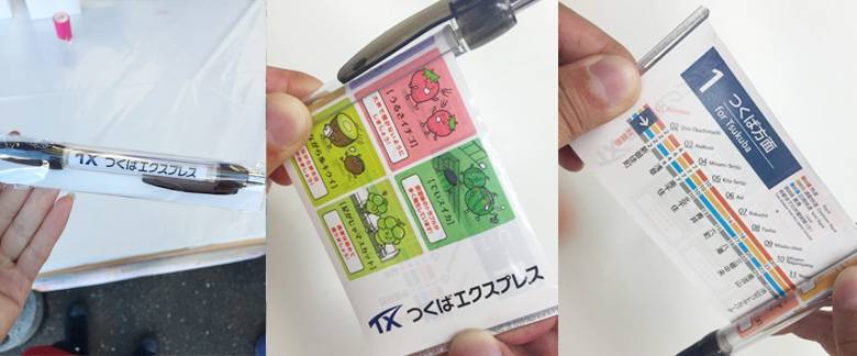 会場では、アンケートに記入するとオリジナルのボールペンももらう事ができました。しかもこのボールペン、ただのペンではなく……。表にはTX駅構内と車内に貼られているマナーポスター「めいわくだもの」シリーズの一覧、裏にはTX路線図が描かれた巻物が内蔵されているのです。シュルルと引き出せるようになっていて、これはプチ自慢のアイテムになりそう。