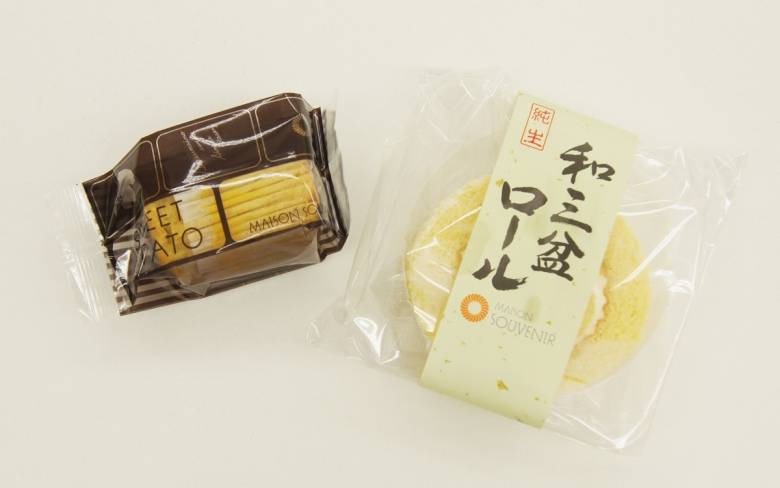 左:紅あずまとパティシエが直炊きした白あんで作ったスイートポテト 右:徳島名産の和三盆糖を贅沢に使っているロールケーキ