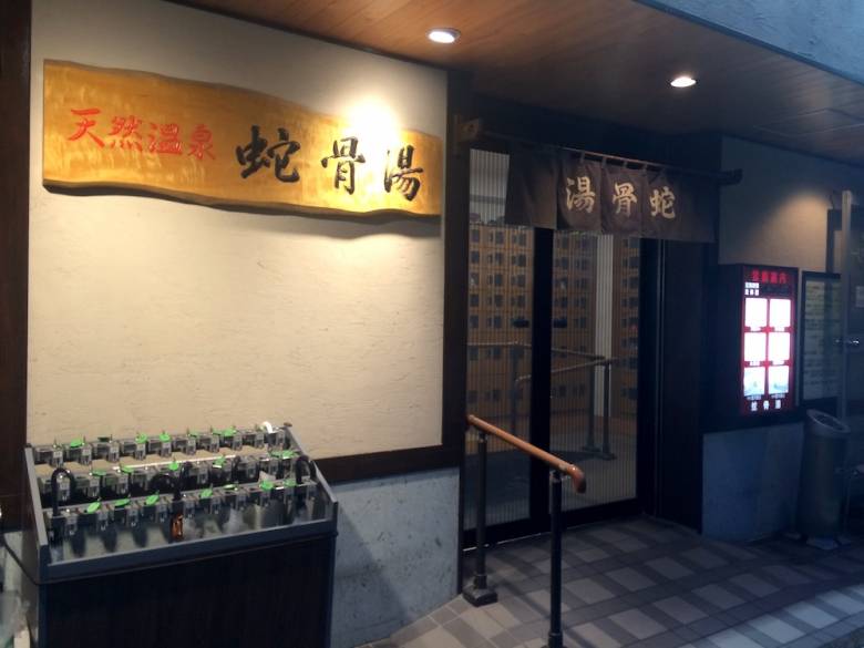 雷門通りの裏路地にある「天然温泉 蛇骨湯」。なんだかびっくりする名前ですが「じゃこつゆ」と読みます。場所が少しわかりにくいかもしれませんが、国際通りから蛇骨湯のコインランドリーが見えるので目印にしましょう。