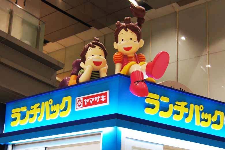 つくばエクスプレス「秋葉原駅」01番出口から入り、長いエレベーターを降りていくと、青い店の屋根の上にランチパックのキャラクター「パックくん」と「ランチちゃん」の姿が見えてきます。