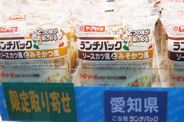 ご当地限定品のランチパックは週替わりで取寄せしているので、まめに入れ替わるようです。この時のご当地限定品は「ソースカツ風とみそかつ風」、「ひるぜん焼きそば」、「西尾の抹茶入りクリーム&つぶあん」が販売されていました。