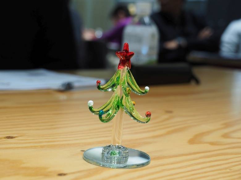 当日、久保先生が各テーブルに、クリスマスの飾り物を用意するように依頼されていて、各机にプラスチックのミニツリーが用意されていました。