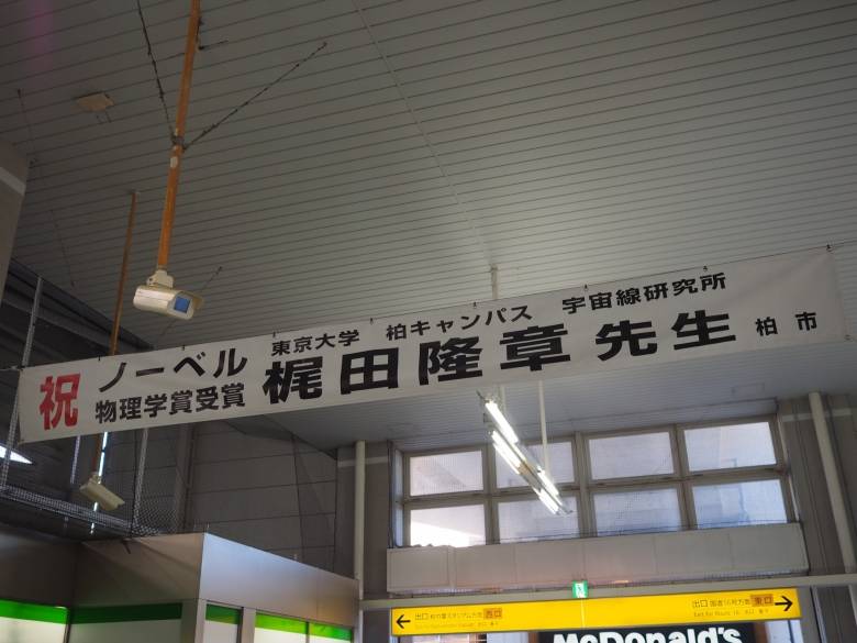 柏の葉キャンパス駅を降りると「梶田隆章先生」のノーベル物理学賞のお祝いの横断幕が