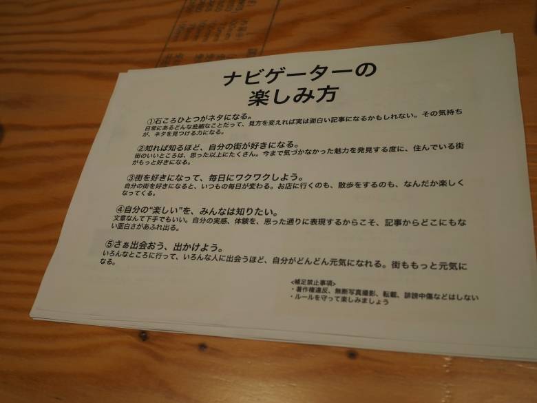 最後は、実際に記事を書くために、ナビゲーターの心得も記した「ナビゲーターの楽しみ方」や、講座の内容をもとに、実際に記事を書くために、ナビゲーターの記事作成と同じ項目がまとめられた用紙が配布され、そこに記事内容をまとめることをしました。