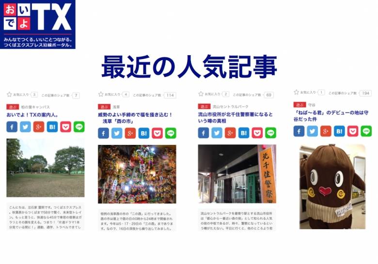 「おいでよTX」はつくばエクスプレス創業10周年を迎え、誕生した市民参加型のポータルサイト。各駅のナビゲーターと呼ばれる記者が情報を発信し、読者は、駅名や「遊ぶ」「育てる」「食べる」などのカテゴリーで情報を検索できます。
