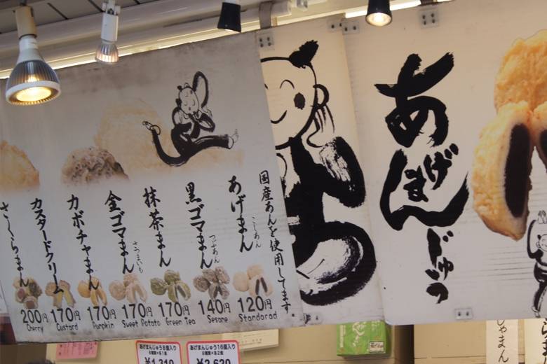 あげまんじゅうの種類は豊富で、「あげまん」「黒ゴマまん」「抹茶まん」「金ゴマまん」「カボチャまん」「カスタードクリームまん」「さくらまん」の7種類。いろいろと気になったものの、初めてだったのでベーシックな「あげまん」(120円)を購入しました。