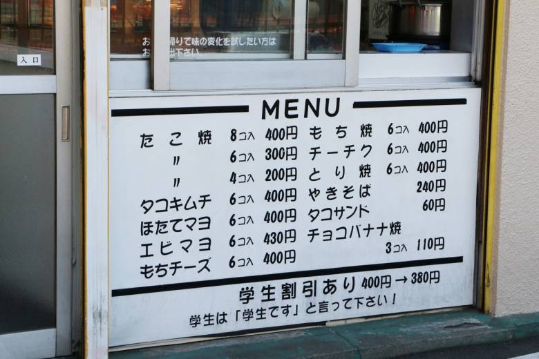 メニューは「たこ焼」「タコキムチ」「ほたてマヨ」など、豊富に揃っています。ショーウィンドーの中にあったタコキムチに呼ばれた気がしたので迷わず注文。店主に伺うと、チャレンジ0.9と1は現在行っていくない(個人で行うのは自由)ので、2から7の間で試してほしいとのこと。7は自宅でも試すことが出来るということなので、チャレンジ2から6のマニュアルに目を通してみる。