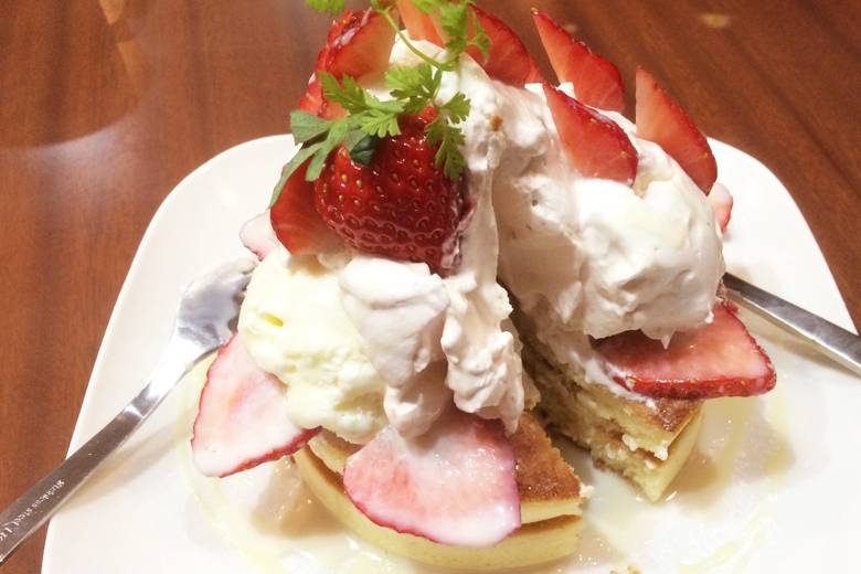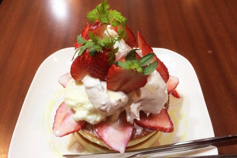クリームもフルーツもとにかくたっぷりで、見た瞬間、わーっと幸せな悲鳴が。自分へのご褒美パンケーキといった感じですね。