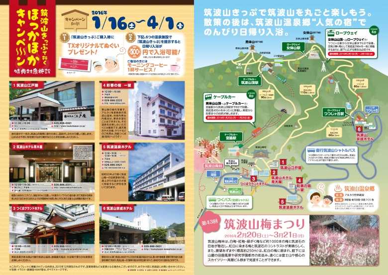 つくばエクスプレスを運営する首都圏新都市鉄道株式会社と、お肌がすべすべになることでも有名な筑波山温泉郷が共同で企画した「筑波山きっぷで行く ほっかほかキャンペーン」が、平成28年1月16日(土)から4月1日(金)までの期間開催されます。