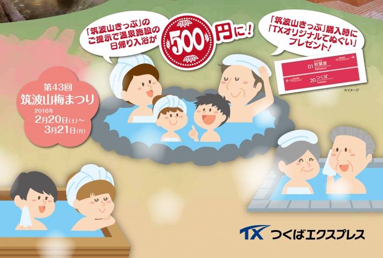 キャンペーン実施期間中は、つくばエクスプレス各駅(つくば駅を除く)で発売している「筑波山きっぷ」を購入いただいた方に、もれなく「TX オリジナル手ぬぐい」をプレゼント。また、筑波山神社周辺にある以下6カ所の温泉施設において当日有効となる「筑波山きっぷ」をご提示いただくと一律500円(1回)の特別価格で日帰り入浴をお楽しみいただけます!