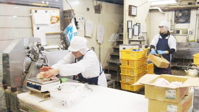 量りを使ってパックする量に分けているところ(「肉の万星食品」)
