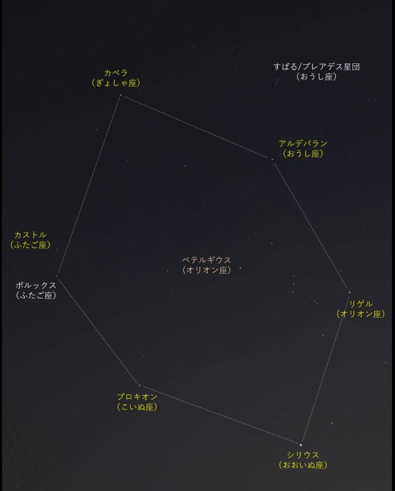 冬の一等星たち。白い点線で結んだ冬のダイヤモンドを構成する6つの恒星のうち、黄色で示した5つは連星。また、ふたご座の二等星カストルも代表的な連星のひとつです(筆者撮影)