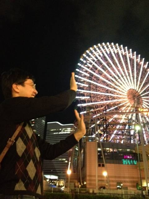 観覧車を押す(?!)筆者。隣り合って見えるけれども奥ゆき方向には差がある、というのはまさにこれと同じ状態です。(筆者の妻撮影)