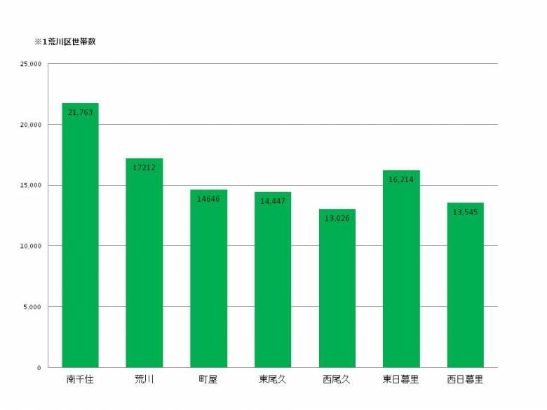 荒川区は、町屋・荒川・西尾久・西日暮里・東尾久・東日暮里・南千住の7つに分かれおり、その区域の中で世帯数第1位なのが南千住です。※1