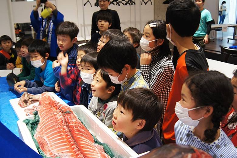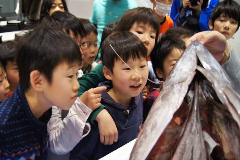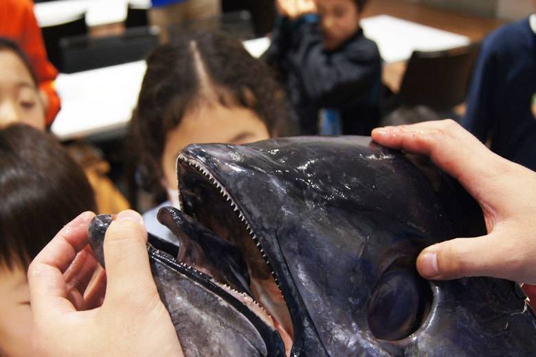 「歯は何本あるの?」「骨は何本あるの?」「なんで目がこんなに大きいの?」「おしりはどこ?」など、普段は切り身の状態でしか見たことのないマグロを間近で見て、子どもたちは大興奮。たくさんの質問が飛び交い、この日一番の盛り上がりを見せました。