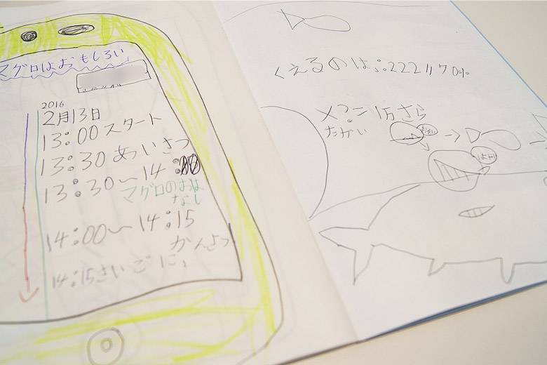 45分間のカリキュラム終了後も、先ほど見たマグロに興奮が冷めやらない子どもたち。この日の感想を書いてもらったところ、「まぐろにベロがあった!」「背びれの動きが面白かった」「目が大きくて迫力があった!」などその日感じたこと、学んだことをそのまま言葉にしたり、イラストを描いたりと本当に楽しそうでした。