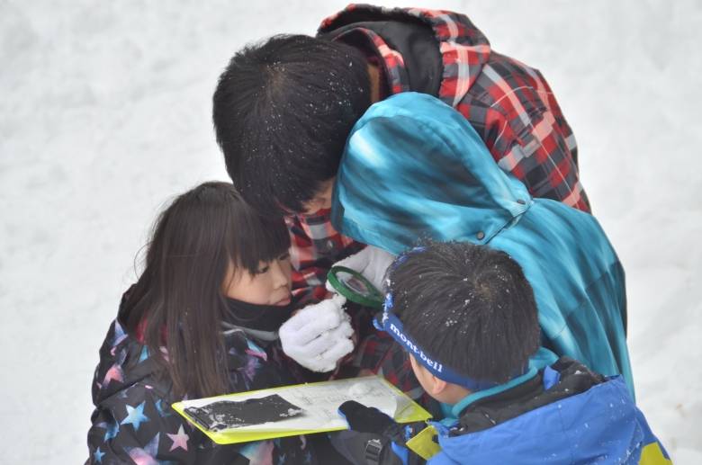 最初の活動は雪の結晶観察。黒い画用紙に雪を集め、ルーペで観察しながらスケッチ用紙に結晶の形を描いていきます。ひとりで一心不乱に観察し続けたり、面白い結晶を探して見せ合ったりと、雪の結晶の多様な姿に見入っていました。中には20種類以上の結晶を見つけ出してスケッチした子もいましたよ!